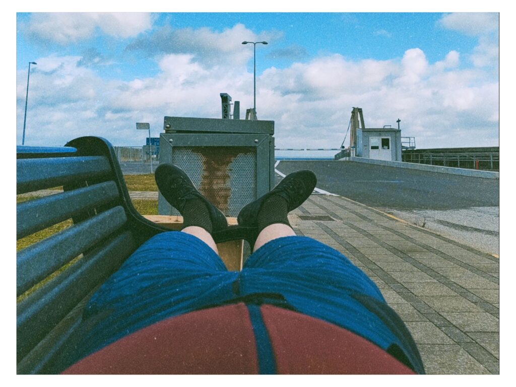 Auf dem Weg zum Hafen in Rudkøbing Sogn besorge ich mir noch ein Abendessen vom Supermarkt. Die Wartezeit von zwei Stunden am Hafen verbringe ich mit Sonnenuntergangsglotzen, lesen und dem Aufsaugen der spätsommerlichen Atmosphäre. Das Herumsitzen ohne voranzukommen tut mir gut. Es hilft mir zu realisieren, wo ich gerade bin. Oft bin ich auf meinen Radreisen wie getrieben. Mache kaum Pause und wenn, nur kurz. Die Tatsache, dass auf meiner Route diverse Fährverbindungen liegen, verschafft mir immer wieder unumgängliche Pausen. Pausen die ich gerne annehme.