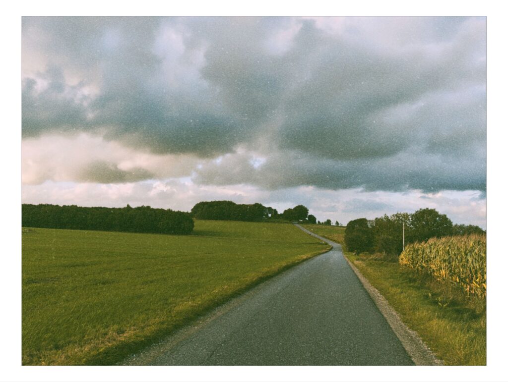 Also geht das Geschrubbe los . Ich will aufholen, was aufzuholen gilt. Motiviert trete ich durch die abwechslungsreiche Landschaft. Das Wetter ist viel weniger gruselig ,als die Wetterkarte es prophezeit hatte. Die Wolken lassen immer wieder mal den blauen Himmel durchblicken und wenn es mal regnet, regnet es zwar heftig. aber dafür nur kurz. Damit kann ich leben. Nicht alles, was unerwartet passiert, ist schlecht. Lediglich der Wind erweist sich als zäher Gegner. Immer häufiger tendiert meine Reiserichtung gegen die Windrichtung. Passagen, in denen ich ziemlich drücken muss, um gefühlt trotzdem kaum vom Fleck zu kommen.